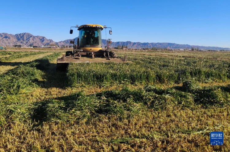 近日,在巴彦淖尔市临河区狼山镇光明村农业示范园区内,麦后复种的燕麦草绿意盎然,农机手正驾驶大型机械收割燕麦草。光明村党支部书记郭成刚说:“我们在收割后的1万多亩麦地里复种燕麦草,整体长势良好,每亩产500公斤优质干草没问题。”