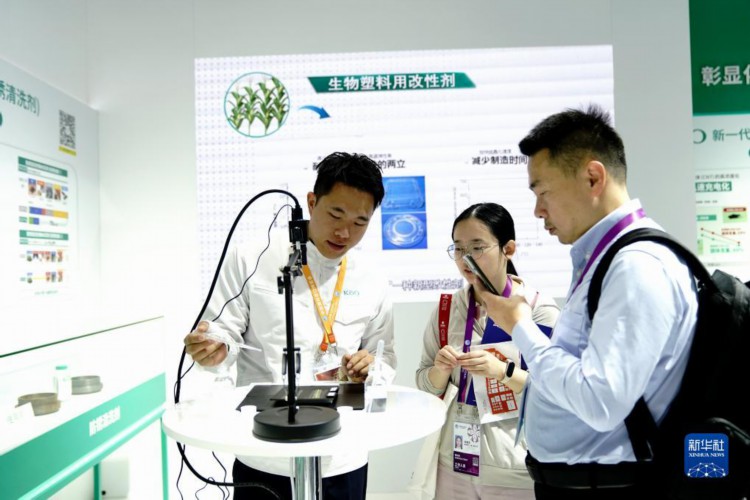 11月9日,在消费品展区花王展台,工作人员向观众演示环保产品“生物塑料用改性剂”的效果。