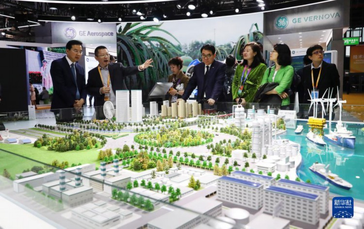 11月9日,参观者在GE公司能源转型全产业链解决方案模型演示沙盘旁交流讨论。