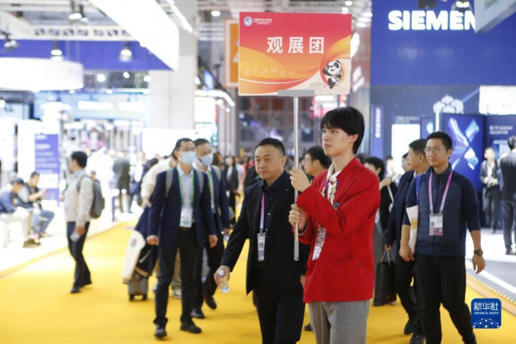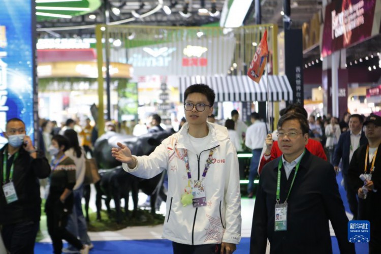 11月7日,在第六届进博会上,上海理工大学志愿者潘奕帆引导观展团参观展区。 新华社记者 陈朔 摄
