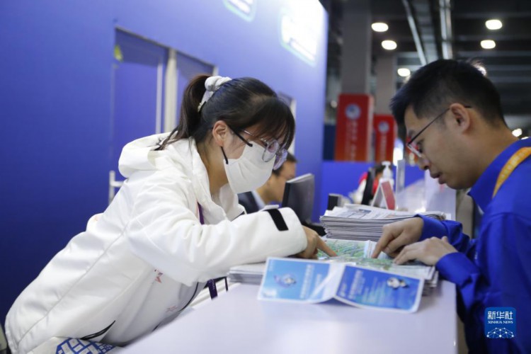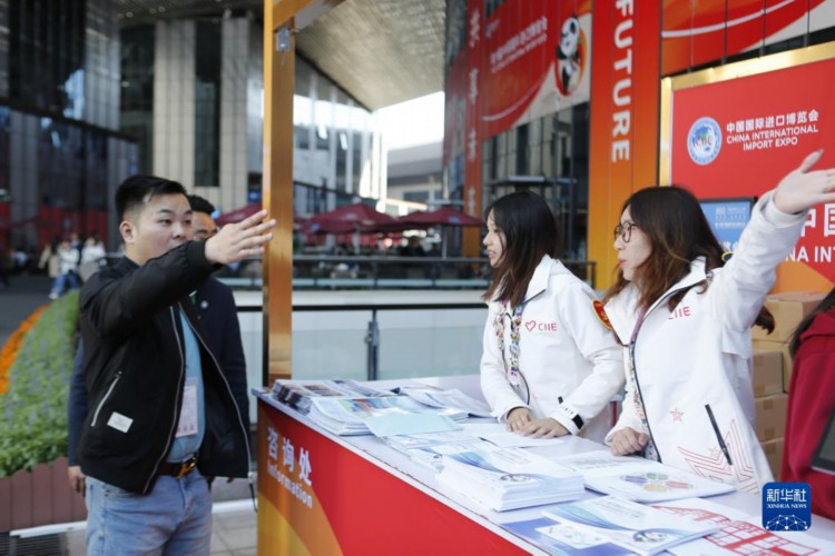 11月7日,在国家会展中心(上海),志愿者为参观者指路。 新华社记者 陈朔 摄
