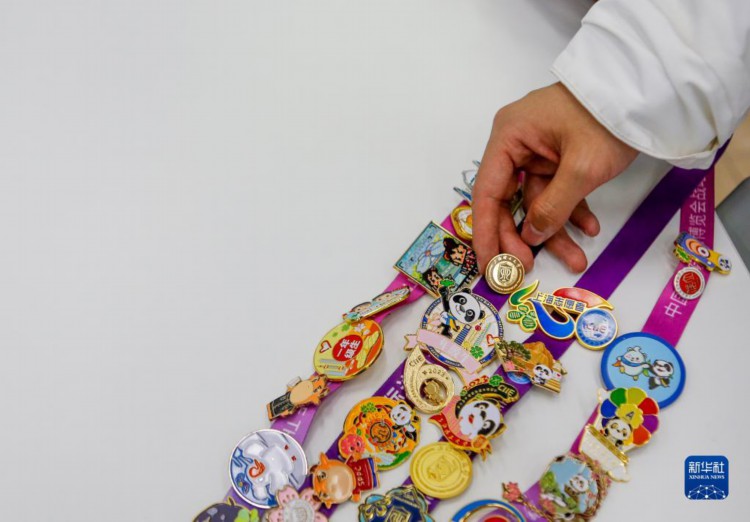 11月7日,在第六届进博会上,上海理工大学志愿者杨宇晨展示收集的徽章。近年,进博会“徽章文化”日益流行,在进博会上交换收集徽章成为不同高校志愿者、展商和参展者结交新朋友的方式。 新华社记者 陈朔 摄