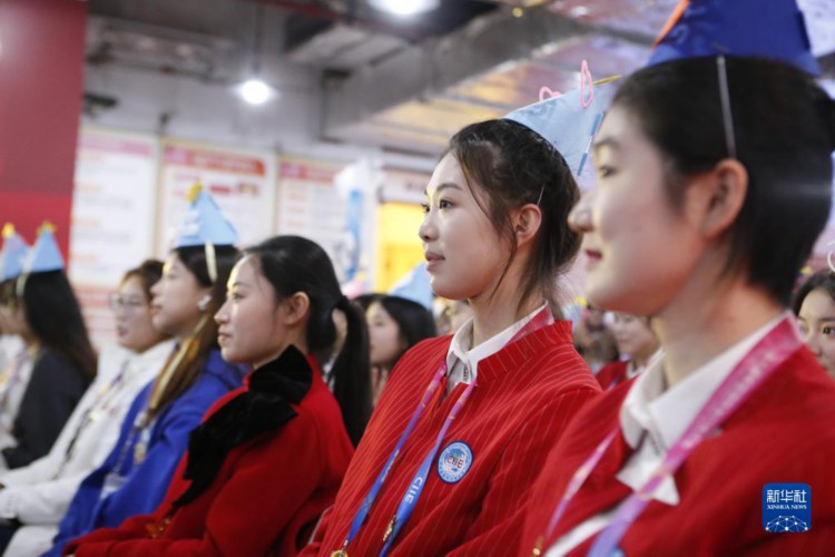 11月7日,在第六届进博会上,东华大学志愿者崔未骅(右二)在参加集体生日会。当日,进博会志愿者之家为进博会期间过生日的“小叶子”举办集体生日会,送上生日惊喜。 新华社记者 陈朔 摄