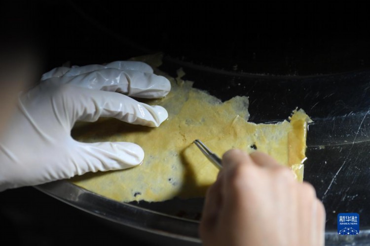 11月9日,工作人员在开化纸传统技艺工坊对修复用纸进行人工除杂。 新华社记者 翁忻旸 摄