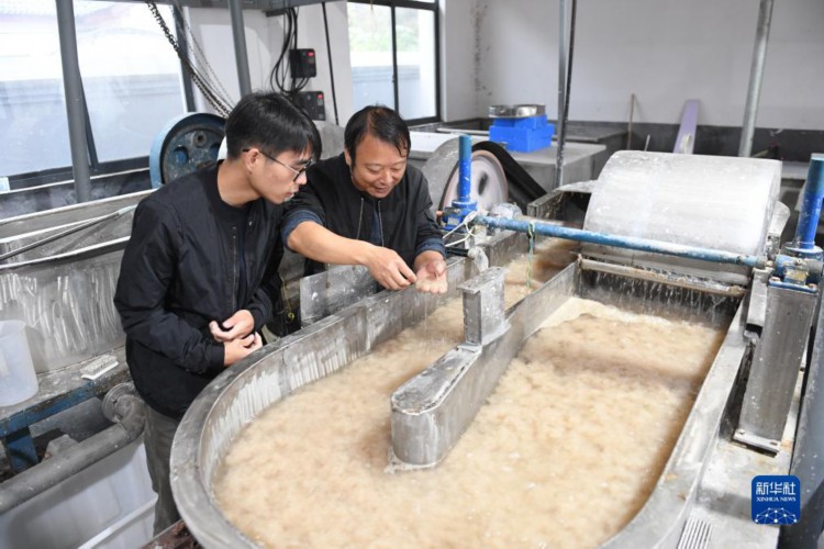 11月9日,在开化纸传统技艺工坊,黄宏健(右)和儿子黄鑫康在查看纸浆的匀度。 新华社记者 翁忻旸 摄