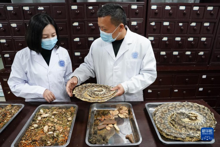 11月8日,在安徽省祁门蛇伤研究所,研究所所长倪永松(右)与工作人员一起盘点蛇药。