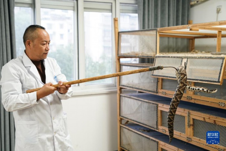 11月8日,在安徽省祁门蛇伤研究所,工作人员取出五步蛇用于研究。