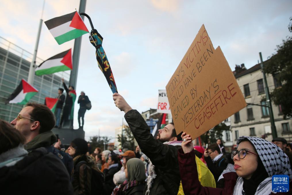 当日,众多巴勒斯坦支持者在比利时布鲁塞尔集会,呼吁尽快实现加沙停火 。