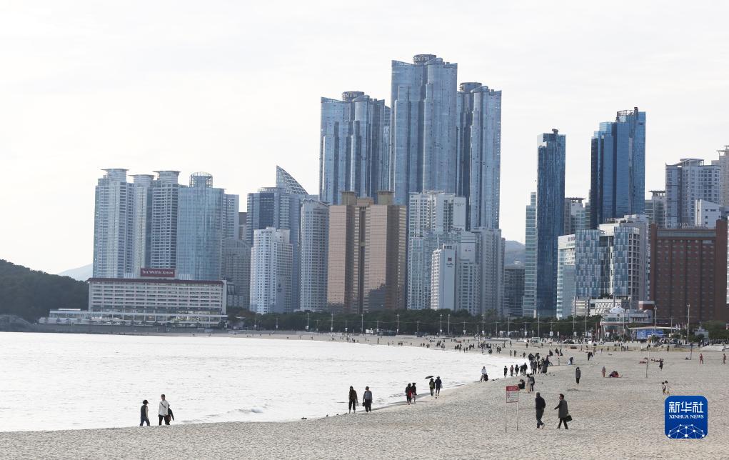 11月10日,人们在韩国釜山市海云台的海滩休闲。