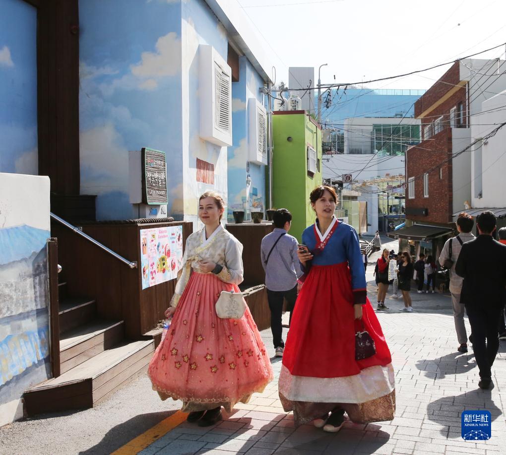 11月9日,游客在韩国釜山市的甘川文化村游玩。