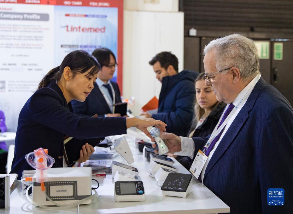 11月13日,在德国杜塞尔多夫国际医疗器械设备展,参观者在凌特公司展位咨询洽谈。新华社记者 张帆 摄