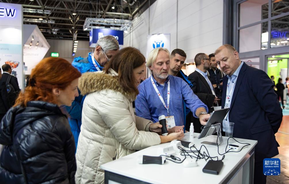 11月13日,参观者在德国杜塞尔多夫国际医疗器械设备展上体验设备。新华社记者 张帆 摄