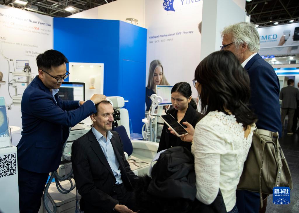 11月13日,在德国杜塞尔多夫国际医疗器械设备展,参观者在英智医疗展位体验经颅磁刺激仪。新华社记者 张帆 摄