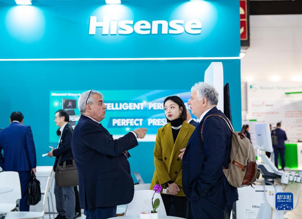 11月13日,在德国杜塞尔多夫国际医疗器械设备展,参观者在海信医疗展位咨询洽谈。新华社记者 张帆 摄