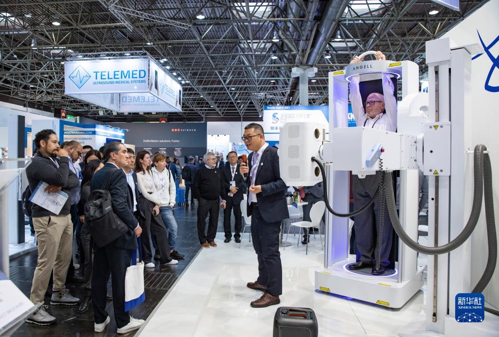 11月13日,在德国杜塞尔多夫国际医疗器械设备展,参观者观看安健科技负重位CT产品海外发布。新华社记者 张帆 摄