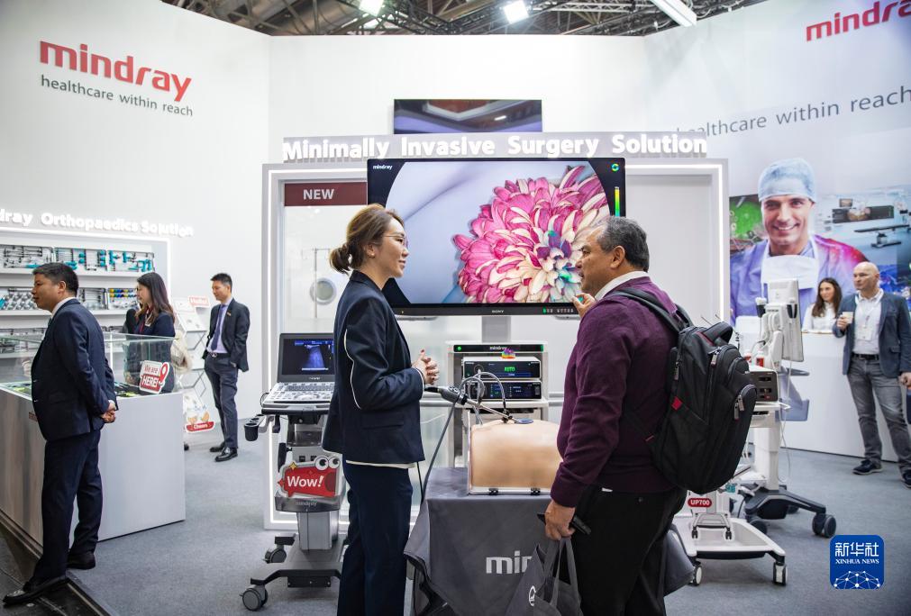 11月13日,在德国杜塞尔多夫国际医疗器械设备展,参观者在迈瑞医疗展位咨询洽谈。新华社记者 张帆 摄