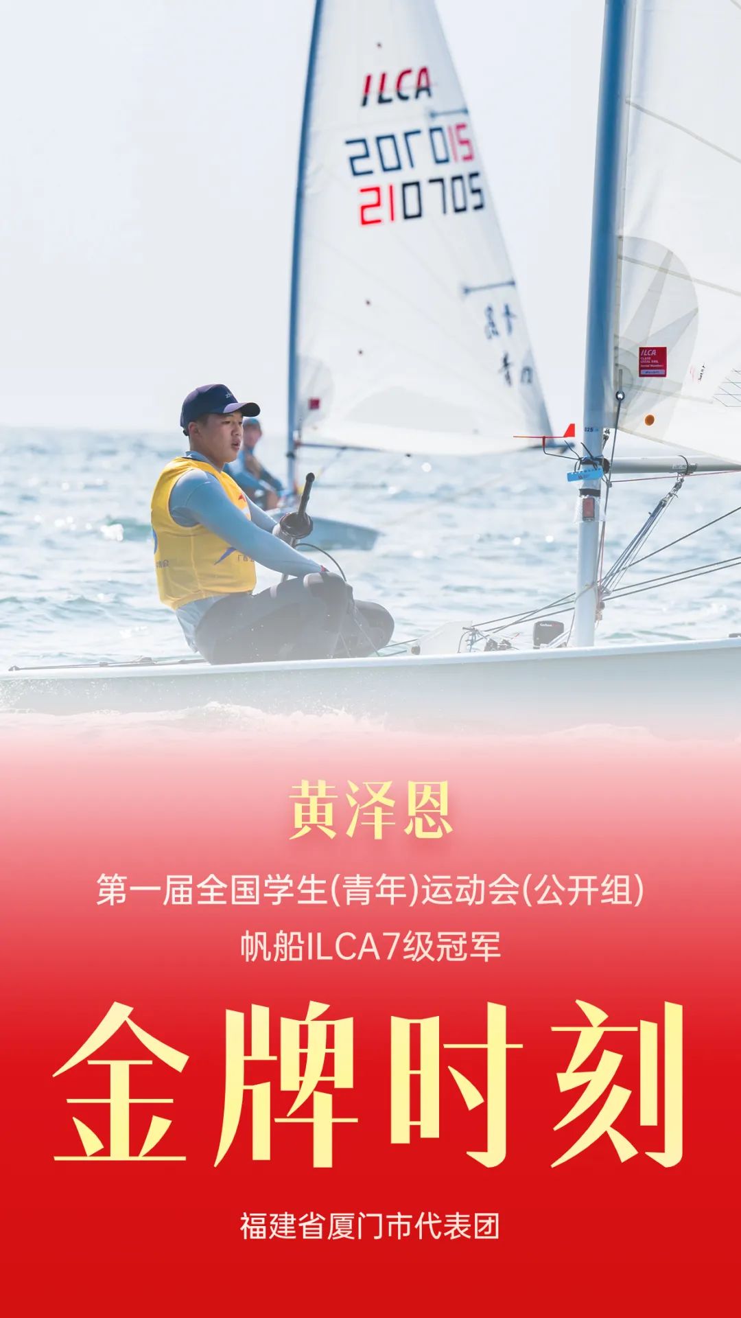 11月13日中午,在第一届全国学生(青年)运动会(公开组)帆船比赛项目中,代表福建省厦门市参赛的运动员黄泽恩在完成6天的决赛中夺得帆船ILCA7级冠军,这也是福建在本届学青会(公开组)取得的第27枚金牌。
