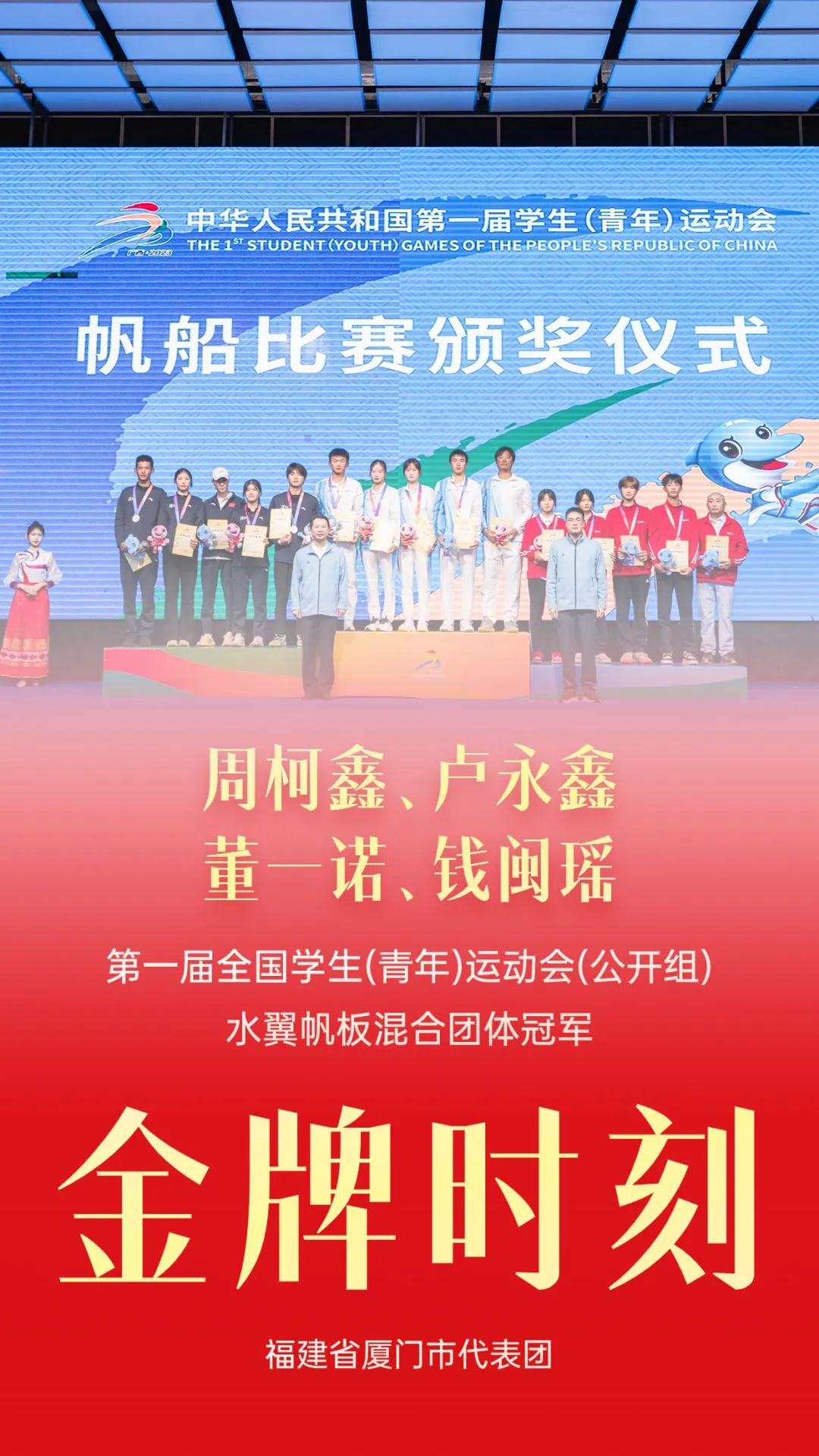 11月13日,在第一届全国学生(青年)运动会(公开组)帆板比赛项目中,代表福建省厦门市参赛的运动员周柯鑫、卢永鑫、董一诺、钱闽瑶夺得水翼帆板混合团体冠军,这也是福建在本届学青会(公开组)取得的第31枚金牌。