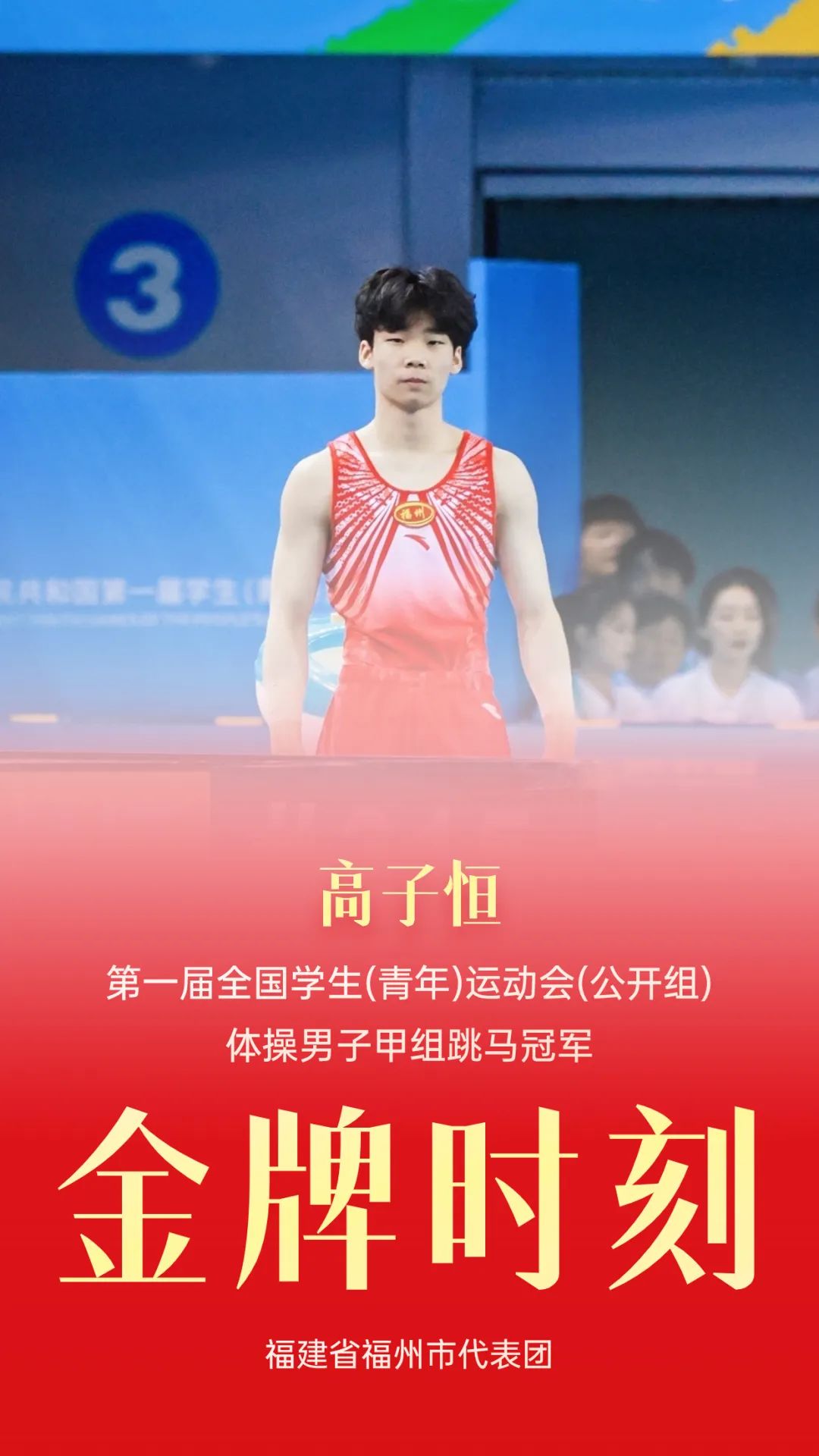 11月13日,在第一届全国学生(青年)运动会(公开组)体操男子甲组跳马决赛中,代表福建省福州市参赛的运动员高子恒以13.966分夺得该项目金牌,这也是福建在本届学青会(公开组)取得的第32枚金牌。