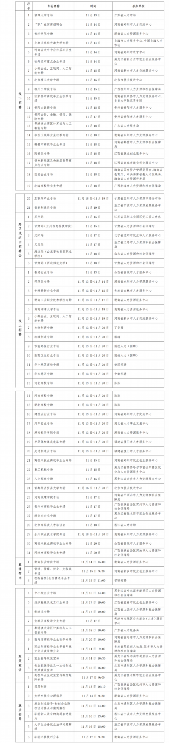 人力资源社会保障部11月14日发布了新一批2023年大中城市联合招聘高校毕业生秋季专场活动。其中包括智能制造、互联网、陶瓷等21场线下专场招聘会,6场跨区域巡回招聘会;教育培训、生物制药、机械制造等31场线上专场招聘会;9场直播带岗活动;4场政策宣讲课以及6场就业指导课。