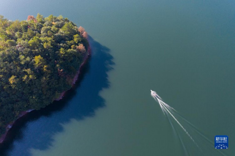 11月14日,淳安县金峰乡锦湖村的低收入农户在金峰乡中华蜂保种基地工作人员的陪同下乘坐小船前往养殖中华蜂的小岛收蜂蜜(无人机照片)。