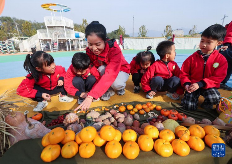 当日,浙江省湖州市长兴县李家巷镇中心幼儿园开展“冬日校园 乐享丰收”校园丰收节主题活动。孩子们在老师的带领下参观丰收节农作物展、手工艺品展,还参加挑担子、运萝卜、接力送玉米等趣味运动,学习知识、锻炼身体,感受丰收带来的喜悦。