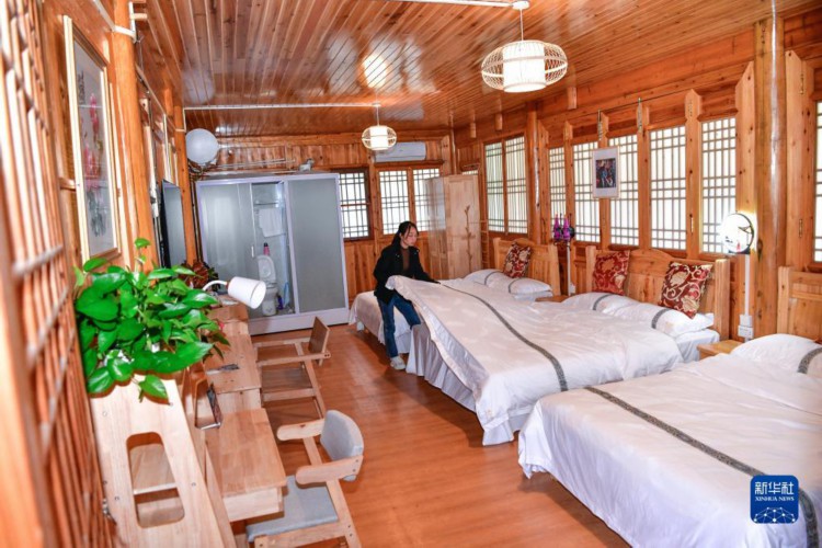 11月15日,贵州省石阡县国荣乡楼上村的村干部在整理民宿床铺。