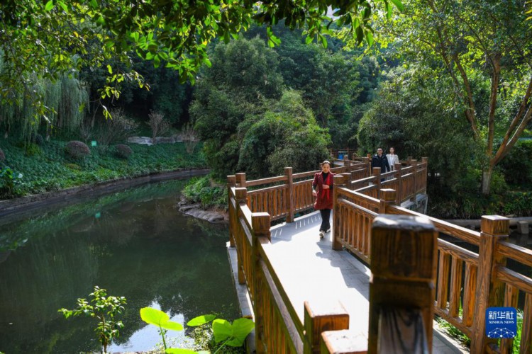 11月16日,在重庆市渝北区龙山街道龙华社区,居民在盘溪河岸边散步、休闲。