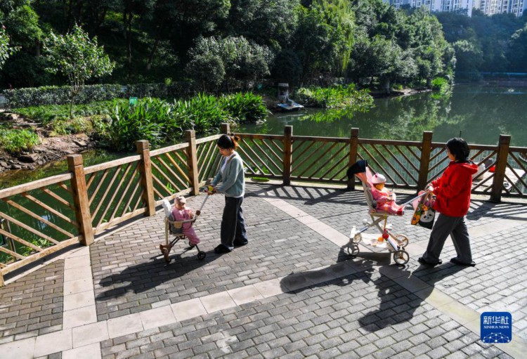 11月16日,在重庆市渝北区龙山街道龙华社区,居民在盘溪河岸边散步、休闲。