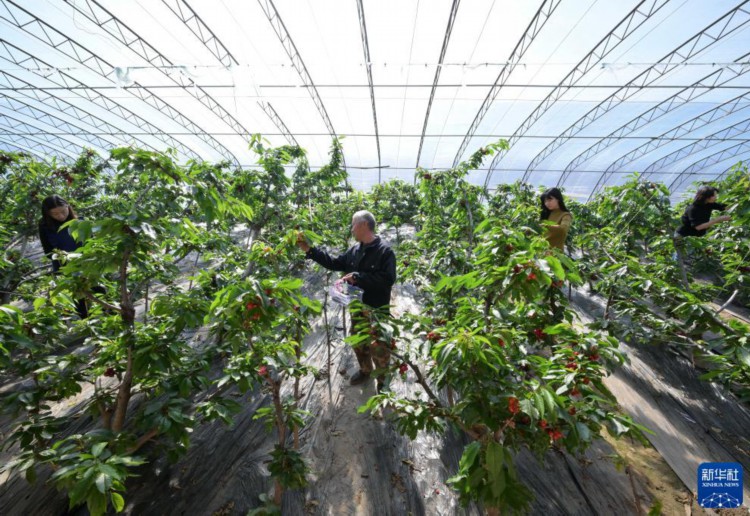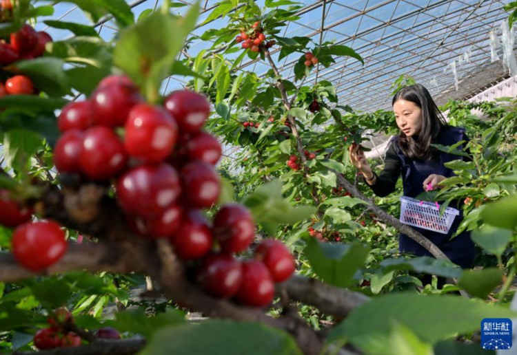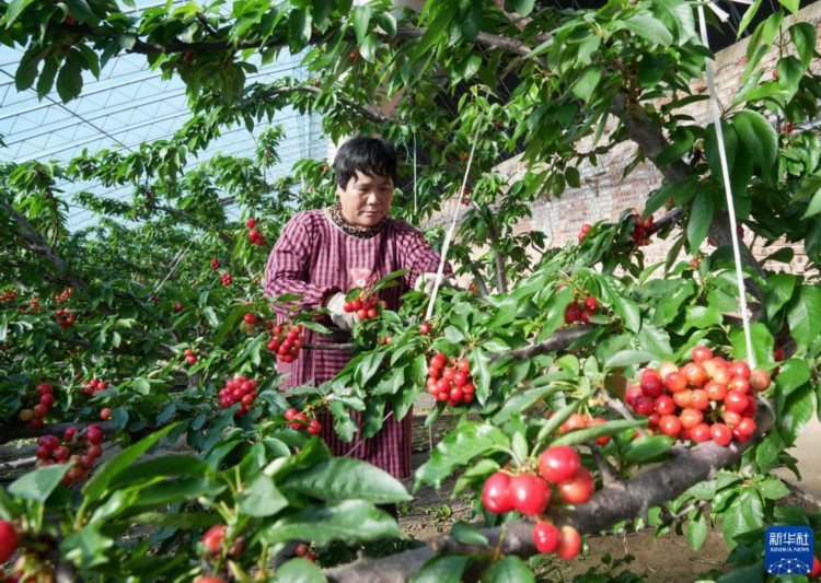 11月16日,河北省乐亭县丞起现代农业园区的工人在大棚内采摘樱桃。 近日,河北省乐亭县丞起现代农业园区不同花期的樱桃树开花、结果,果农忙着管护、采摘,大棚内一派忙碌景象。近年来,乐亭县引导农民采取“合作社+农户”的模式种植大棚樱桃、桃、葡萄等果品,促进农民增收。 新华社记者 杨世尧 摄