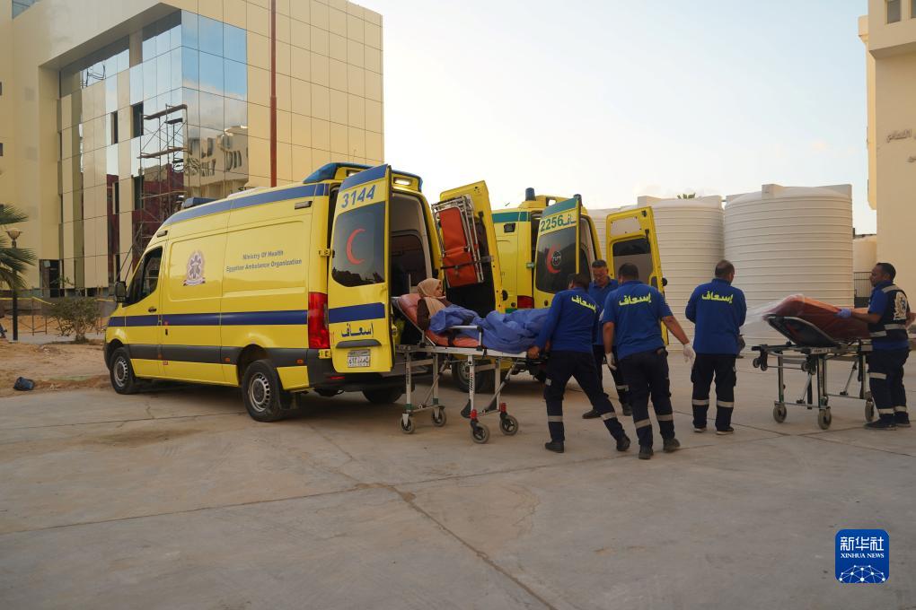 11月15日,在埃及北西奈省,阿里什医院的工作人员转运患者。新华社记者 姚兵 摄