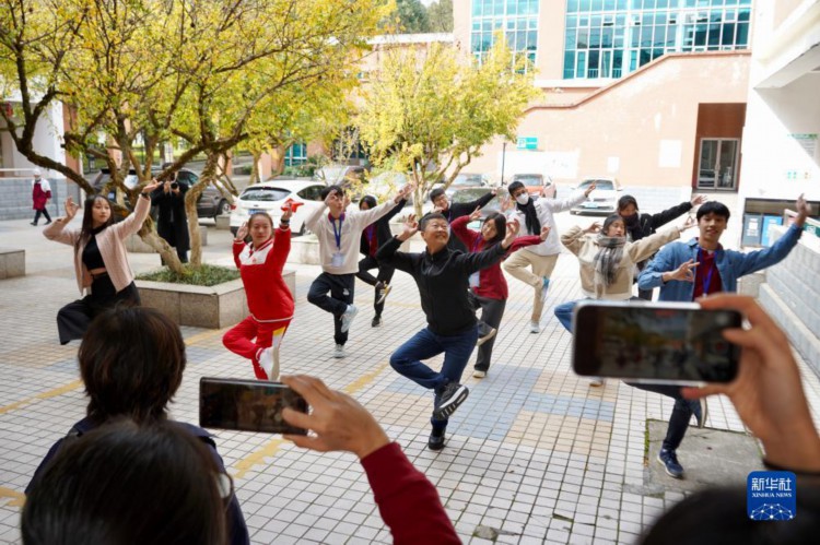 “张老师,请你带着学生‘飞出来’!”课后,在其他老师提议下,张军带着十几名两校学生一起,模拟敦煌飞天反弹琵琶的经典姿势照了合影。