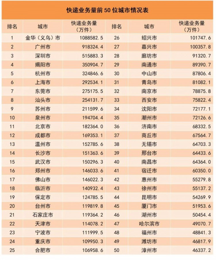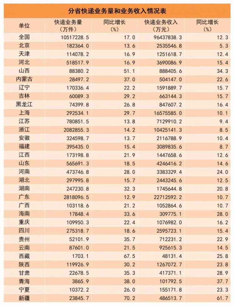1-10月,同城快递业务量累计完成108.3亿件,同比增长2.7%;异地快递业务量累计完成919.2亿件,同比增长18.2%;国际/港澳台快递业务量累计完成24.2亿件,同比增长55.1%。