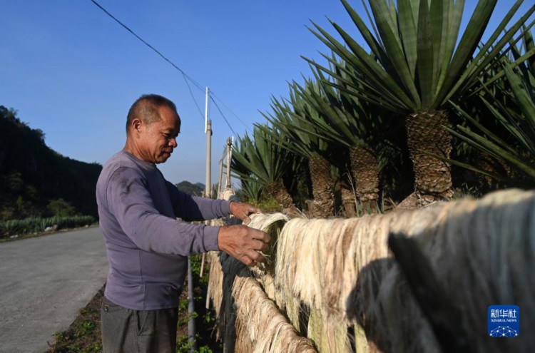 11月20日,在广西平果市旧城镇康马村,一名村民在晾晒剑麻。
