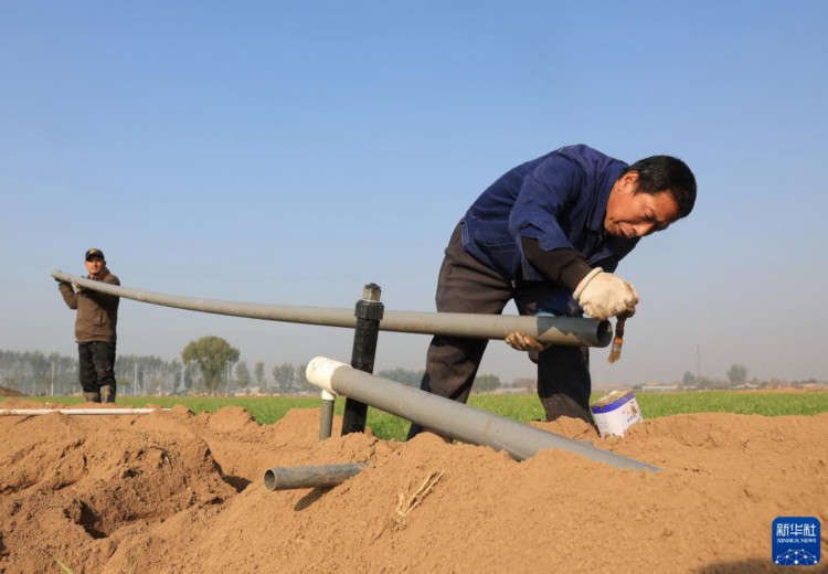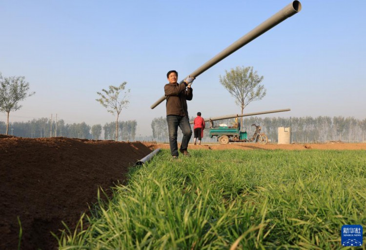 11月20日,工人在河北省晋州市周家庄乡第七生产队的麦田里搬运准备安装的节水灌溉管道。 近日,河北省晋州市的农民利用冬闲时节在农田安装、检修节水喷灌设施,田间地头呈现出一派繁忙景象。近年来,河北省晋州市持续推进高标准良田建设,促进农业增产、农民增收。据介绍,目前该市建设高标准良田达33万亩。 新华社记者 杨世尧 摄