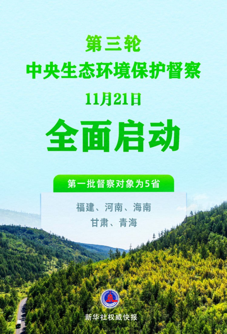 新华社北京11月21日电(记者高敬)根据《中央生态环境保护督察工作规定》,经党中央、国务院批准,第三轮中央生态环境保护督察11月21日全面启动。第一批组建5个中央生态环境保护督察组,分别对福建、河南、海南、甘肃、青海5个省开展为期约1个月的督察进驻工作。