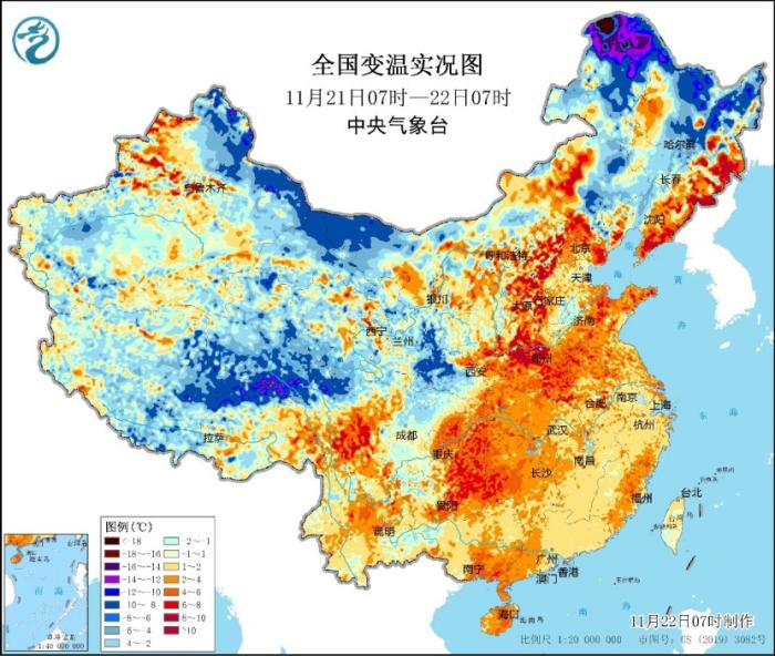 中新网11月22日电 据中央气象台网站消息,今晨,中东部大部地区仍有不同程度的回暖,但这也将是本轮寒潮过程来前最后的温暖。目前冷空气已经开始影响黑龙江西北部,漠河今晨气温达到-27.3℃,比昨日同时刻降低20℃。中央气象台今晨继续发布寒潮、暴雪、大风三个预警。其中,未来24小时,内蒙古东部、黑龙江中东部将有大范围强降雪,需要特别小心!