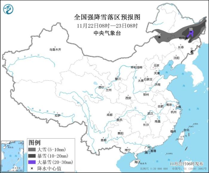 暴雪黄色预警:预计,11月22日08时至11月23日08时,内蒙古东部、黑龙江中东部、吉林北部和长白山区等地的部分地区有大到暴雪,其中,黑龙江中部局地有大暴雪(20~22毫米);上述地区新增积雪深度6~12厘米,局地可达16厘米以上。