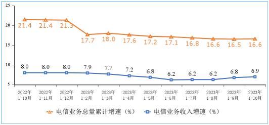 电信业务量收均实现小幅提升。1—10月份,电信业务收入累计完成14168亿元,同比增长6.9%,增速较前三季度提升0.1个百分点。按照上年不变价计算的电信业务总量同比增长16.6%。