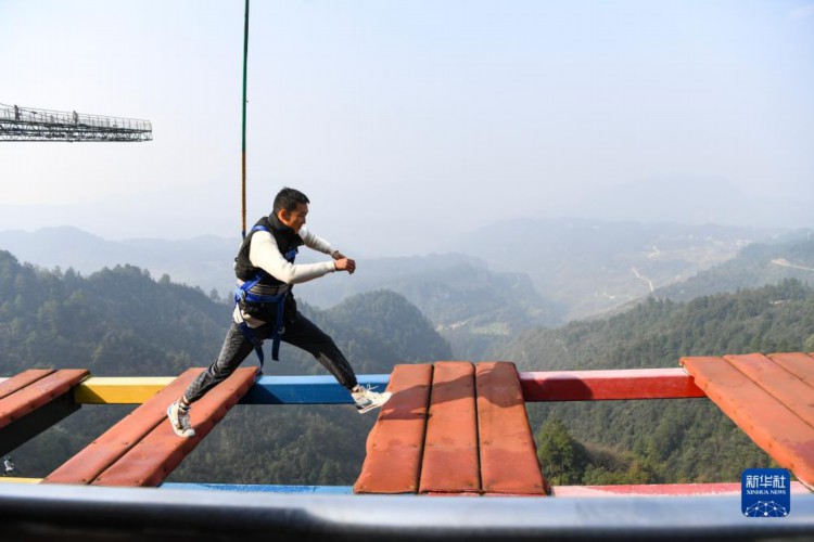 11月21日,游客在重庆市万盛经开区奥陶纪景区体验“极限飞跃”游玩项目。