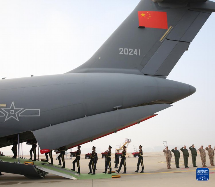 11月23日,在韩国仁川国际机场,中国人民解放军礼兵护送烈士棺椁登上解放军空军专机。 新华社记者 姚琪琳 摄
