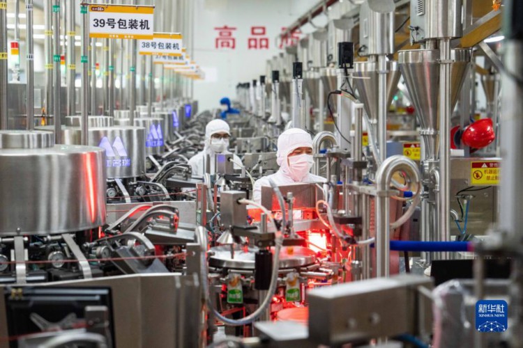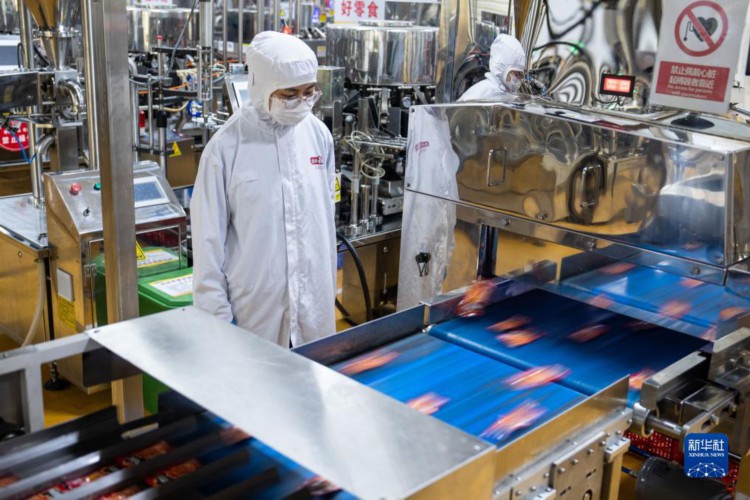 11月23日,在盐津铺子浏阳生产基地,工人在进行产品包装。 近年来,湖南省长沙市浏阳市积极探索以“舌尖上的智能制造”助推食品安全的新路径,不断加大食品生产加工企业技术改造支持力度,加快食品产业转型升级步伐,建成了以浏阳经开区、省级农业科技园为核心的食品产业基地,拥有食品生产企业449家,规上工业企业116家,2022年实现规模工业总产值245.3亿元。 新华社记者 陈思汗 摄