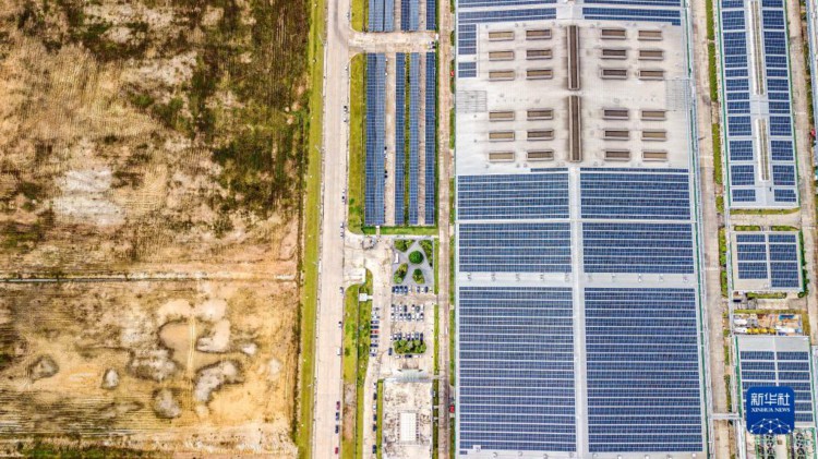 这是11月7日在泰国春武里府拍摄的工厂屋顶光伏发电项目现场(无人机照片)。 泰国目前最大的工厂屋顶光伏发电项目位于距首都曼谷约100公里的春武里府WHA伟华工业区内,由中国企业浦林成山与泰国WHA伟华基础设施及电力大众有限公司合作建设。一期项目装机容量19.44兆瓦,于2022年11月底开始运行。项目二期工程预计明年完工,运行并网后总装机容量将达到24.24兆瓦,年发电量3000余万度,每年可减排二氧化碳3万吨、节约1.5万吨标准煤。 新华社记者 王腾 摄