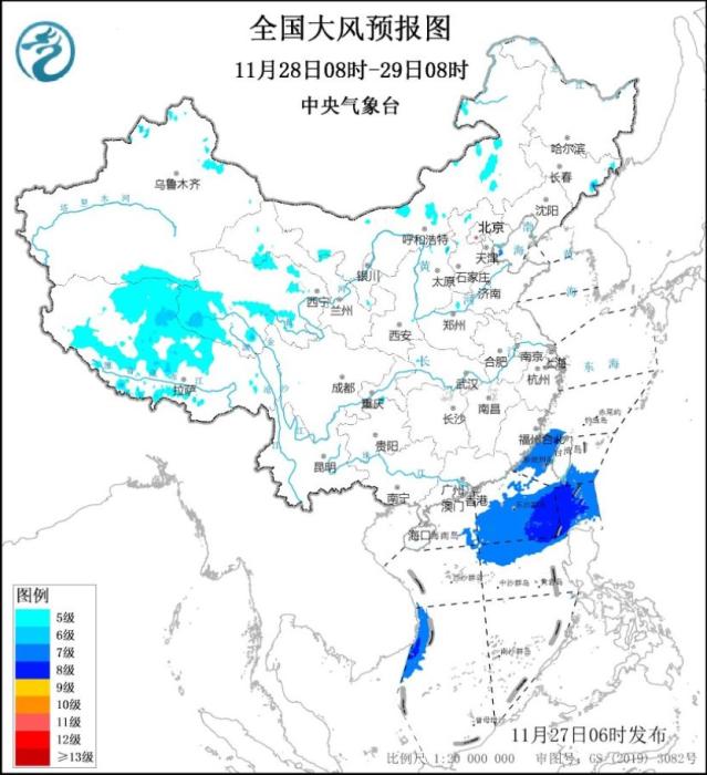 受冷空气影响,11月27日08时至28日08时,内蒙古中西部和东南部、西藏西南部、青海西部、西北地区东北部、山西大部、台湾岛等地有5级、阵风6级的大风,其中,宁夏中南部、山西中北部、台湾岛南部等地部分地区有6级、阵风7级的大风,山西北部等地部分地区有8级、阵风9级的大风;台湾海峡、巴士海峡、南海东北部和西南部海域将有7级、阵风8级的大风,其中南海西南部部分海域风力可达8级、阵风9级。11月28日08时至29日08时,西藏大部等地有5级、阵风6级的大风,其中,西藏北部、青海西部等地部分地区有6级、阵风7级的大风;台湾海峡、巴士海峡、南海东北部和西南部海域将有7~8级、阵风9级的大风。中央气象台11月27日06时继续发布大风蓝色预警。