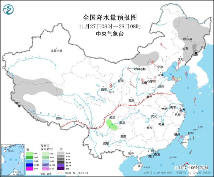 11月27日08时至28日08时,内蒙古东南部、东北地区大部、西藏西南部及昆仑山脉地区、山东半岛等地部分地区有小到中雪或雨夹雪,其中,吉林长白山区、西藏西南部局地有大雪(5~8毫米)。陕西北部、内蒙古中东部、华北大部、辽东半岛、山东半岛等地部分地区有4~6级风。甘肃河西局地有浮尘。