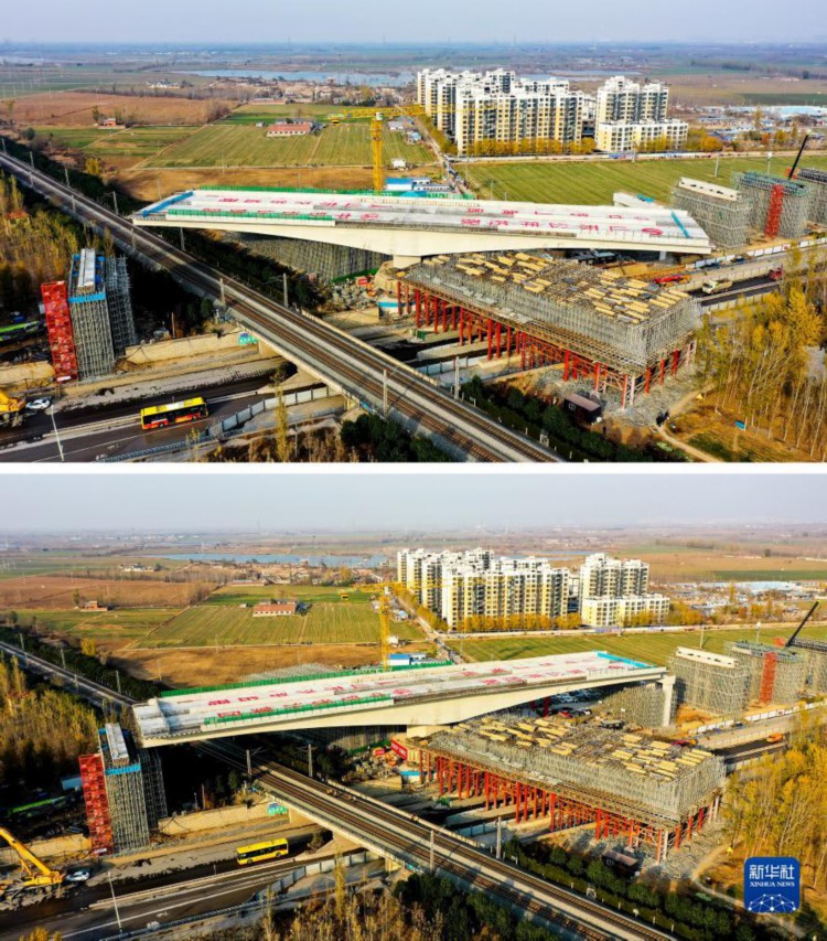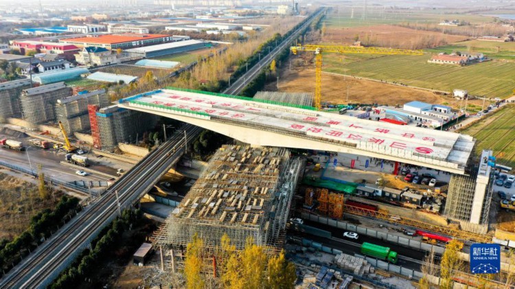 11月28日,由中铁上海局承建的济(宁)曲(阜)快速路上跨京沪铁路立交桥连续梁在转体作业中(无人机照片)。 当日,由中铁上海局承建的济(宁)曲(阜)快速路上跨京沪铁路立交桥2×80米T构连续梁成功完成转体作业,为全线通车奠定了基础。 新华社记者 郭绪雷 摄