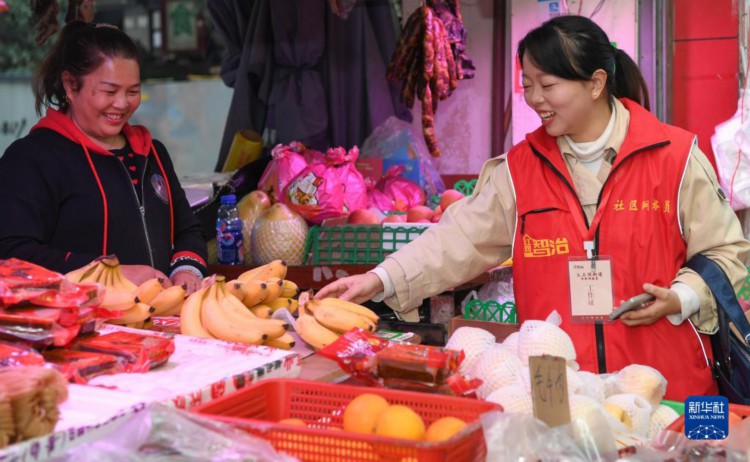 11月28日,余白杨对正街社区一商铺进行日常走访。 新华社记者 王全超 摄