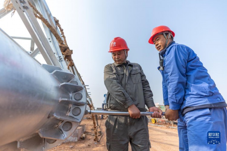 11月28日,在位于重庆市铜梁区少云镇的铜梁1000千伏变电站施工现场,国网重庆送变电公司施工人员在吊装前对构架梁进行检查。