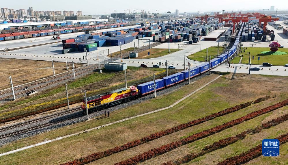 11月28日,X8155次中欧班列从西安国际港站驶出(无人机照片)。