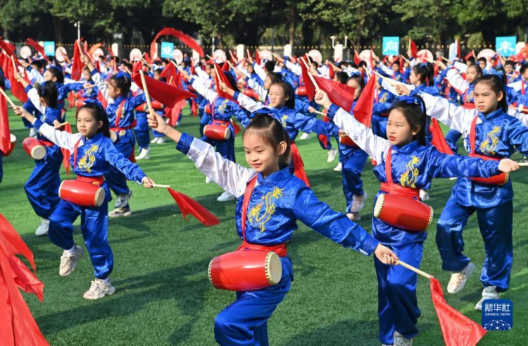 11月29日,孩子们在滨湖路小学表演歌舞《幸福山歌》。 当日,广西南宁市滨湖路小学举行主题为“逐梦新时代 健体向未来”的体育文化节。开幕式上,孩子们表演民族歌舞,跳腰鼓舞,展示阳光运动团体操,共度欢乐时光。 新华社记者 周华 摄